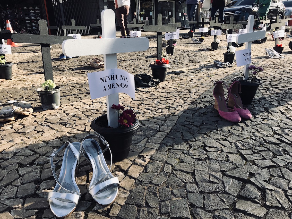 Em Guarapuava, 82 cruzes foram colocadas no calçadão da XV de Novembro, representando todas as mulheres que foram mortas no Paraná entre maio de 2018 e maio de 2019.