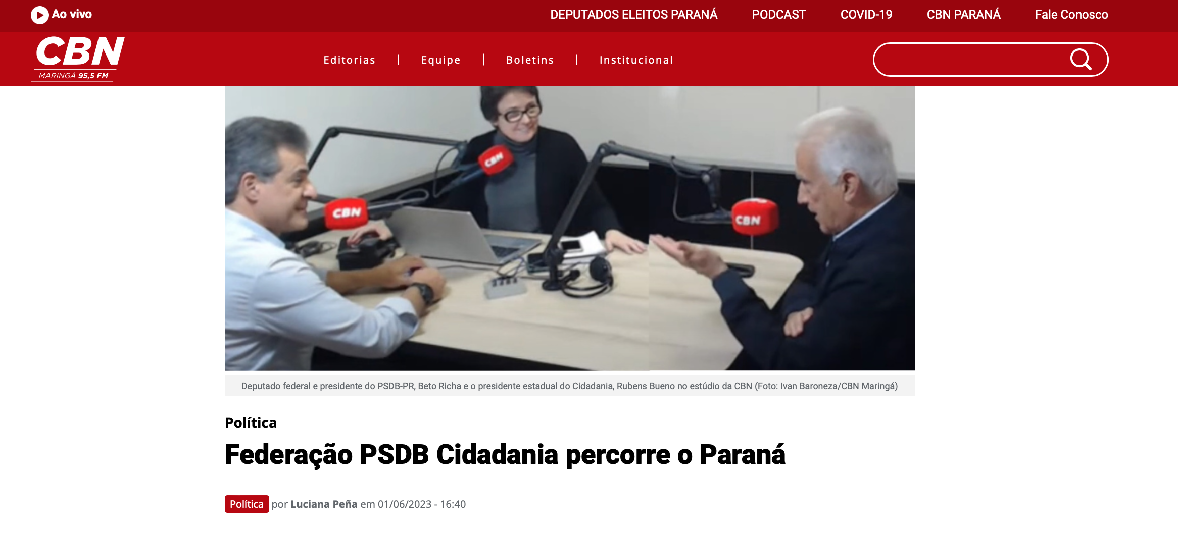 A federação formada pelos partidos políticos PSDB e Cidadania está percorrendo os municípios do Paraná para reunir correligionários e mobilizar as lideranças para as eleições de 2024. O presidente estadual do Cidadania, Rubens Bueno, e o presidente estadual do PSDB, Beto Richa, dizem que a sintonia entre as legendas é histórica e por isso não há dificuldades nesta caminhada. Uma vez formadas, as legendas precisam se manter unidas por no mínimo quatro anos. Para a eleição de 2024, os partidos podem fazer coligações para a disputa nas Câmaras Legislativas, mas a indicação para a eleição majoritária precisa ser da federação. Em Maringá, há nomes como Luciano Pozza, Evandro Oliveira e Wilson Quinteiro.