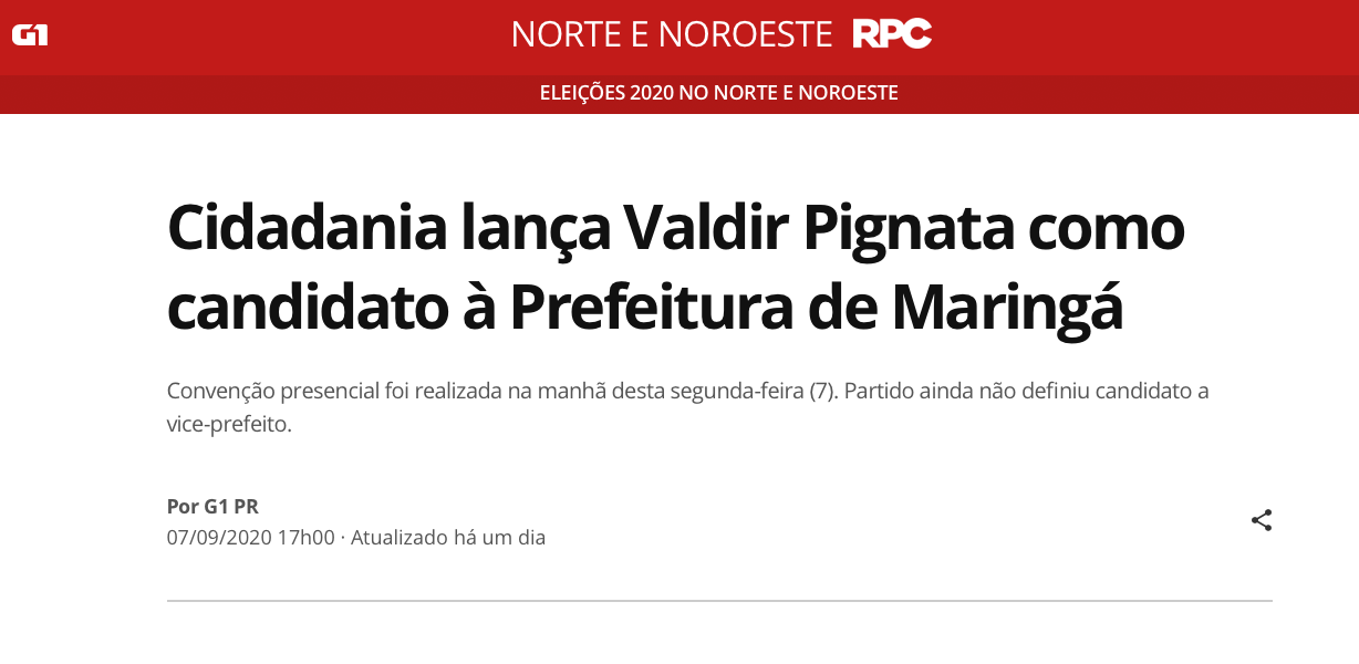 O Partido Cidadania lançou Valdir Pignata, de 62 anos, como candidato à Prefeitura de Maringá, no norte do Paraná. O partido ainda não definiu o candidato a vice-prefeito da chapa.