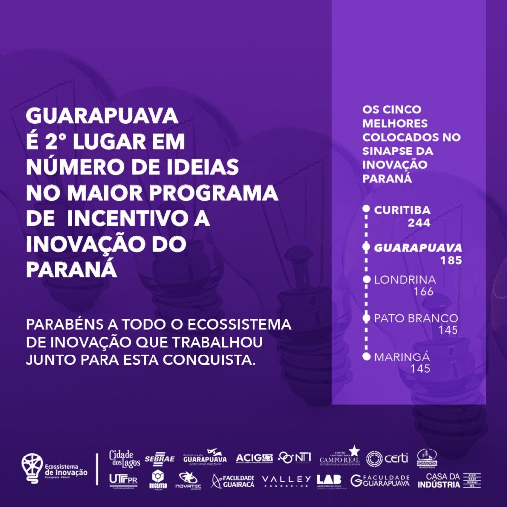 Guarapuava dá um novo passo em seu processo de formação como cidade inovadora. O município foi destaque no maior programa de incentivo à inovação no Paraná, alcançando a marca de 2ª cidade em número de ideias no Sinapse de Inovação, programa que busca transformar projetos de estudantes, pesquisadores e profissionais em negócios de sucesso. Entre todos os municípios participantes no Paraná, Guarapuava ficou atrás apenas da capital Curitiba, superando cidades com mais tradição nessa área como Toledo, Pato Branco e Londrina. “Esse é um resultado concreto de uma mudança de perfil, de ambiente em nossa cidade. Percebemos que há um ambiente focado em inovação se fortalecendo aqui e que está levando jovens, empresários e pesquisadores a pensar no ramo de tecnologia e inovação. Para nós, é motivo de orgulho e felicidade, com a sinalização concreta de que estamos no caminho certo”, comemorou o prefeito, Cesar Silvestri Filho.