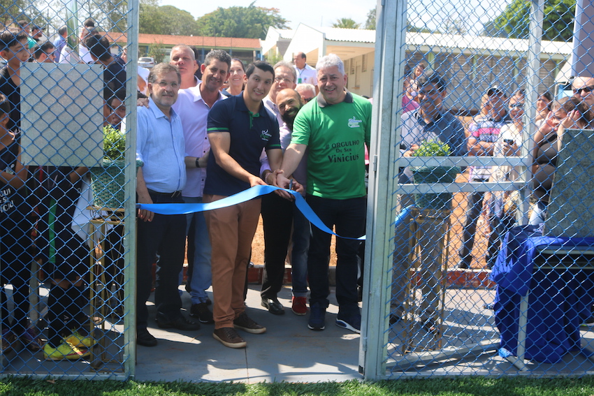 O secretário de Estado do Esporte e do Turismo, Douglas Fabrício, que também é deputado estadual, o prefeito Tauillo Tezelli e o diretor do Colégio Estadual Vinícius de Moraes, Raoni de Assis, inauguraram a Arena Multiuso Esportiva, instalada nas dependências do estabelecimento educacional, localizado na Conjunto Milton Luiz Pereira “Cohapar”, em uma solenidade que reuniu lideranças e comunidade na manhã desta quinta-feira, 14, em Campo Mourão. Uma Arena Esportiva já está em funcionamento no Parque Municipal do Conjunto Parigot de Souza (Asa Leste) e outras duas Arenas Esportivas serão inauguradas nos próximos dias no Parque do Lago e no Colégio Estadual Marechal Rondon. A Arena Multiuso Esportiva é composta por alambrados, arquibancadas e gramado sintético bem como vestiários, desenvolvido pelo Governo do Paraná, através da Secretaria de Estado do Esporte e do Turismo. Sendo mais uma opção de esporte e lazer no município, a estrutura esportiva foi disponibilizada para a prática de futebol, handebol, vôlei, tênis, badminton, entre outras modalidades.