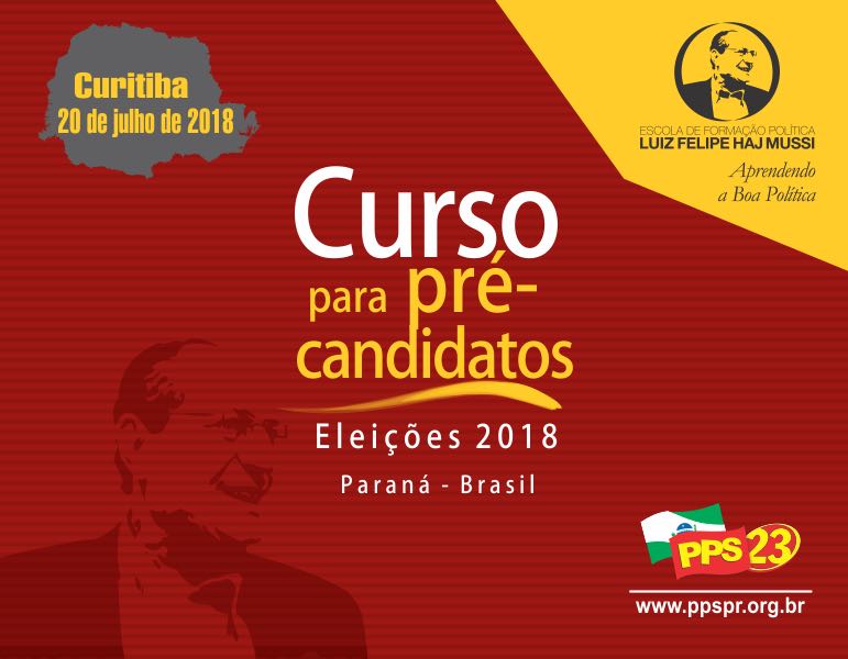 O diretório estadual do PPS do Paraná promove nesta sexta-feira, 20, o “Curso Para Pré-candidatos”, em Curitiba. O evento será realizado em parceria com a Escola de Formação Política Dr. Luiz Felipe Haj Mussi e é de caráter obrigatório para quem deseja ser candidato pelo partido em outubro. O encontro será realizado no Hotel Centro Europeu, localizado na Praça Osório (Centro), com início às 08h.
