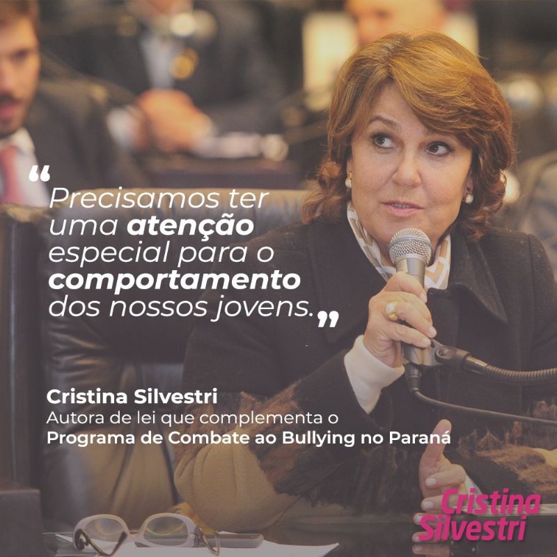 A deputada estadual Cristina Silvestri (PPS), autora da Lei que complementou no Paraná o Programa de Combate ao Bullying, relembrou a importância das escolas terem uma atenção especial para o comportamento de seus estudantes, crianças e adolescentes. O complemento à lei foi sancionado pelo Governo do Estado no final de 2018 e, atualmente, está em fase de alinhamento para que ações efetivas comecem a ser realizadas nos municípios.