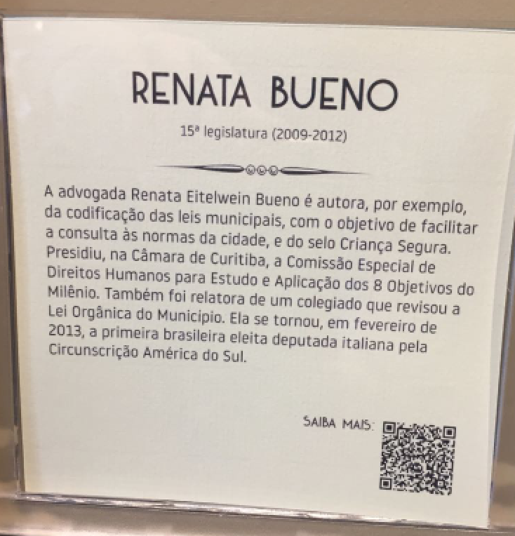 Em comemoração ao dia internacional da Mulher, nesta quinta-feira, 8, foi reinaugurada a galeria “Vereadoras na Política de Curitiba”. O espaço, inaugurado inicialmente em 2014, agora foi revitalizado e abriga não só as biografias, mas também conta a trajetória das conquistas na luta por direitos iguais no parlamento. Uma das homenageadas pela Câmara Municipal de Curitiba é Renata Eitelwein Bueno (PPS). Advogada de formação, Renata é filha do deputado federal Rubens Bueno e foi vereadora em Curitiba na legislatura de 2009 a 2012.