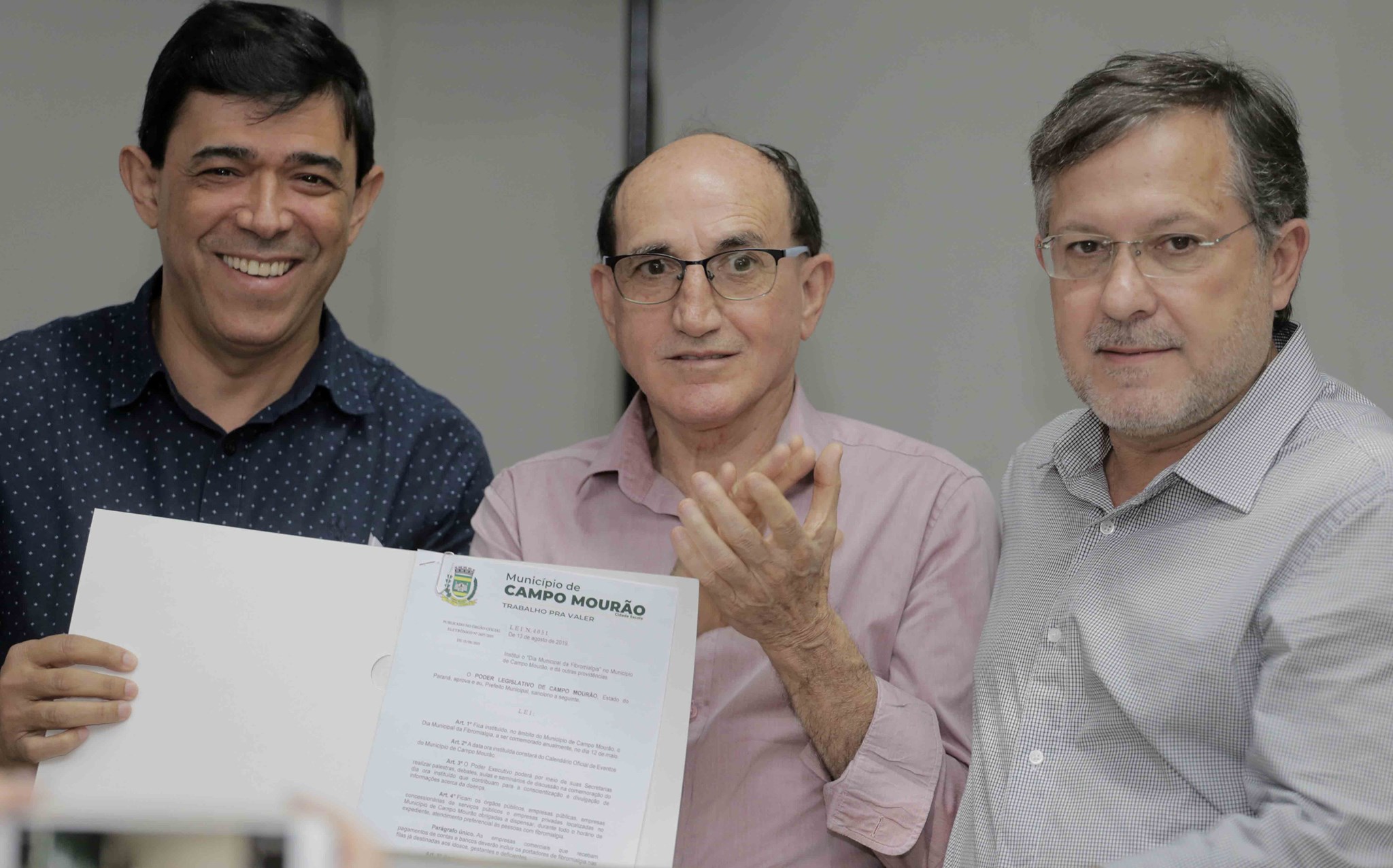 Pessoas que sofrem de fibromialgia em Campo Mourão terão atendimento preferencial e outros direitos assegurados, a lei foi sancionada ontem (13/08) pelo Prefeito Tauillo no Paço Municipal. A lei que INSTITUI O DIA MUNICIPAL DA FIBROMIALGIA, além de inserir no calendário oficial de eventos do município o dia da fibromialgia, a ser comemorado todo dia 12 de maio, reconhece e amplia direitos aos fibromiálgicos.