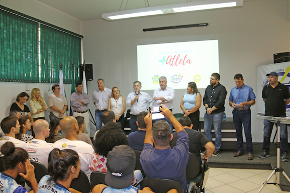Foi lançado na manhã desta sexta-feira, 2, no Auditório da Prefeitura Municipal de Campo Mourão, pelo prefeito Tauillo Tezelli, o Projeto Campo Mourão Mais Atleta, numa parceria entre a Fundação de Esportes (Fecam) e Secretaria da Educação. Estiveram presentes o Secretário Especial do Esporte, Recreação e Lazer; Marcelo de Oliveira Lima, a Secretária da Educação Tania Caetano, o Secretário do Esporte e do Turismo do Estado do Paraná e deputado estadual licenciado Douglas Fabricio e os vereadores Elvira Schen, Sidnei Jardim, Nelita Piacentini, Edoel Rocha e Sidney Ronaldo Ribeiro (Tucano); bem como a Secretária Municipal da Educação Tania Caetano e a Chefe do Núcleo Regional de Educação Rosimeire Decaires, assim como técnicos desportivos, professores, atletas e diretores de escolas municipais. Também esteve presente um representante das empresas patrocinadoras do esporte local (Harrison Brait), do Centro Universitário Integrado. O coordenador técnico da Fecam, Bruno Villa, um dos grandes mentores do projeto, também esteve presente.