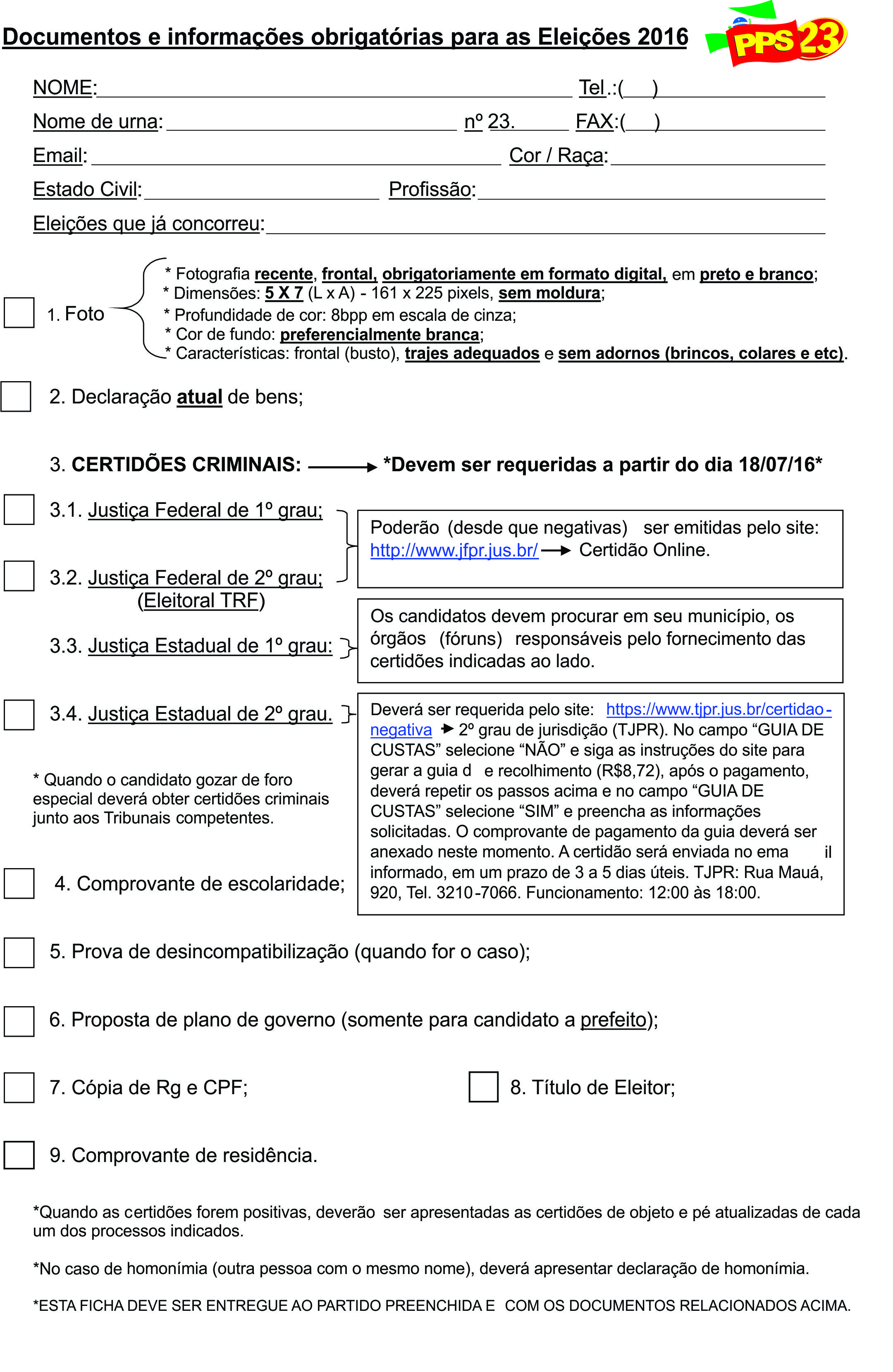 Para quem vai concorrer às Eleições 2016, apresentamos abaixo um rol de documentos e informações obrigatórios a todos os candidatos. É importante que a lista apresentada seja totalmente atendida.