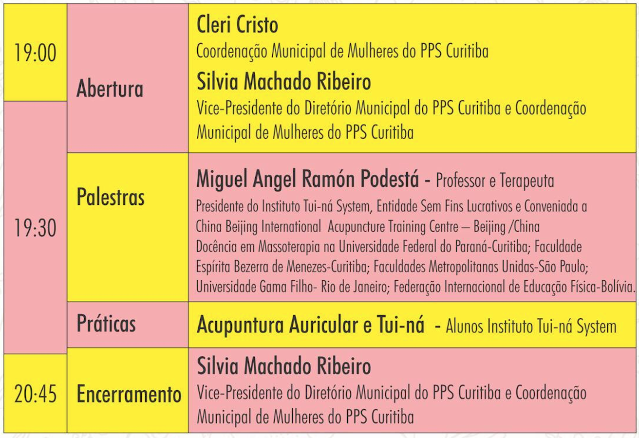 O evento que está sendo organizado pela Coordenação Municipal das Mulheres do PPS de Curitiba, contará com palestras e praticas da acupuntura auricular e tui-ná. Um dos convidados será o Professor e Terapeuta Miguel Angel Ramón Podestá.