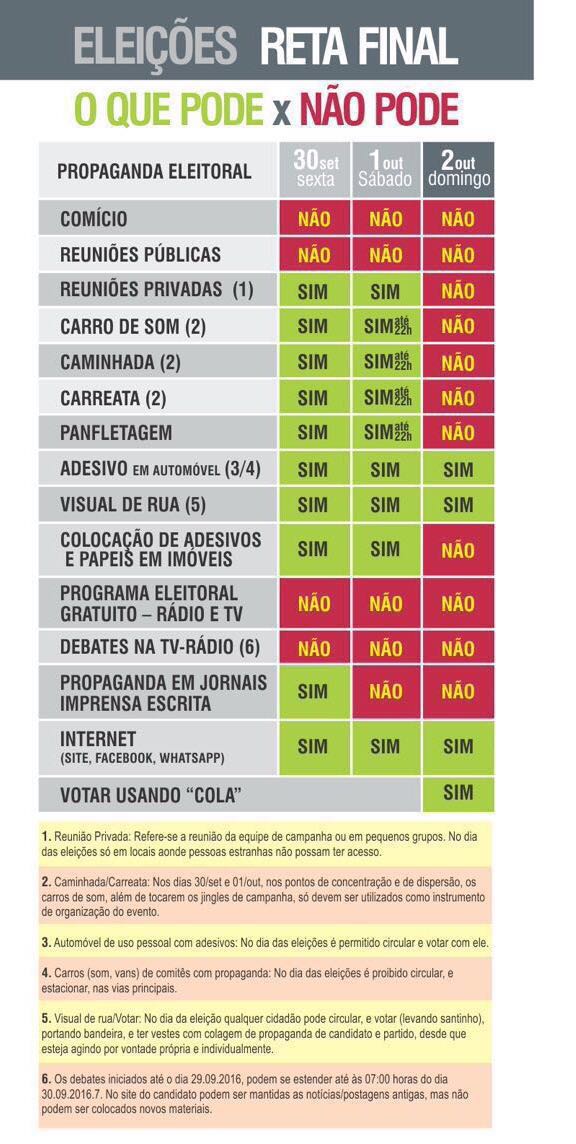 Na reta final da campanha eleitoral, os comícios e reuniões publicas com os candidatos a prefeito, vice-prefeito e vereador estão proibidas pela Justiça Eleitoral a partir da sexta-feira (30). Veja na tabela abaixo o que pode e o que não pode até o dia da eleição.